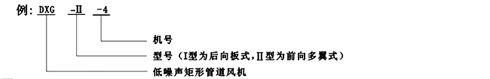 DXG系列風機采用低噪聲風機專用電機與離心式葉輪直聯傳動,方式進出風口,可直接送風,與風管同軸安裝而不需機房,結構緊湊、高速低,兼有管道風機的高流量及箱形風機的低噪聲。具有噪聲低、耗電省、安裝方便、運行穩定等優點。 二、型號說明 ![]() 三、性能參數表 DXG-Ⅰ型(后向板式)(噪聲:聲壓水平相對于 3m 遠之周圍環境測得)