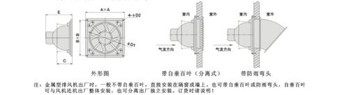 二、工程塑料型排風(fēng)機(jī)外形及安裝示意圖 ![]() 注:工程塑料排風(fēng)機(jī)出廠時(shí),出風(fēng)口處帶自垂百葉,能在效防止室外雨水、蚊子進(jìn)入室內(nèi)。 三、金屬型排風(fēng)機(jī)外形及安裝示意圖 ![]() 注:金屬型排風(fēng)機(jī)出廠時(shí),一般不帶自百葉,直接安裝在隔窗或墻上。也可帶自垂百葉或防雨彎頭,自垂百葉可與風(fēng)機(jī)連機(jī)出廠整體安裝,也可分離出廠獨(dú)立安裝。訂貨時(shí)請(qǐng)說(shuō)明! |